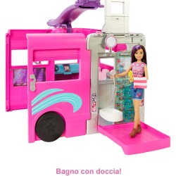 Barbie-Camper dei Sogni Playset con Veicolo, con Ruote, Piscina, Scivolo, 7 Aree Gioco e Oltre 60 Accessori da Campeggio, Giocattolo per Bambini 3+ Anni, HCD46