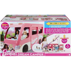 Percorri la strada dell avventura con il Camper dei Sogni di Barbie, dotato di un fantastico scivolo, 7 aree gioco e tutto ciò di cui hai bisogno per giocare e immaginare un esclusiva gita in campeggio! Le ruote funzionanti e una cabina a 2 posti ispirano il gioco con tanti viaggi: carica il camper e spingilo per dare inizio alla storia. Una volta arrivati a destinazione, i bambini possono aprire il camper e rivelare una cucina, una zona pranzo, una zona notte, un bagno, una piscina, uno scivolo, un area falò e molto altro ancora. Quando le bambole sono pronte rinfrescarsi, i bambini possono aiutarle a salire sulla scaletta e farle scendere giù per lo scivolo per un bel tuffo in piscina! Ispira entusiasmanti storie in campeggio con oltre 60 accessori, tra cui un foglio adesivi per personalizzare il camper, 2 cagnolini, mobili, utensili da cucina, calde copertine e molto altro ancora. Con una trasformazione elettrizzante e così tanti pezzi per inventare storie, il Camper dei Sogni di Barbie è il regalo ideale per i giovani avventurieri tra i 3 e i 7 anni.