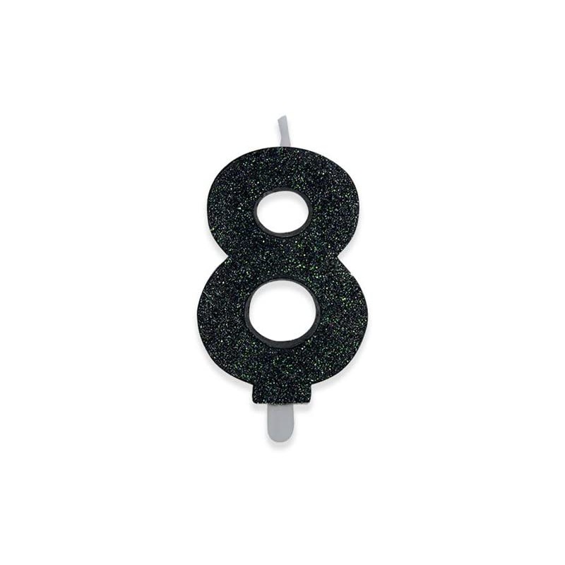 Candelina numero 8 di cera sweety nero glitter, DI73888, per decorare le tue torte di compleanno.