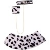 Set composto da coprispalle, collarino e polsino in peluche bianco a macchie nere che ricorda il pelo di un cane dalmata. Kit di accessori da donna diabolica, perfetto per un travestimento in occasione di Halloween o Carnevale.