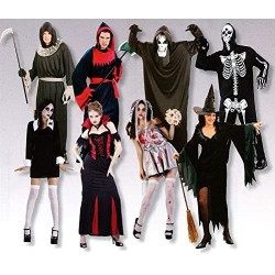 Assortimento di 8 costumi di Halloween per adulti di taglia standard, con 4 travestimenti di Halloween da uomo e 4 travestimenti di Halloween da donna. Un modello di ogni dimensione standard. Ideale per travestire un gruppo di adulti in occasione di un evento: teatro, carnevale, halloween.