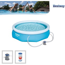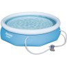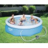 Kit piscina fuori terra. L installazione generalmente può essere effettuata da 2-3 persone e richiede circa 10 minuti, esclusa la preparazione e il riempimento del terreno. Montaggio semplice nelle fasi 1-2-3. Contenuto: Una piscina, una pompa a filtro, toppa per riparazioni Pompa a Filtro Flowclear Portata (capacità) della pompa: 1,249 L/h (330 gal./h). Capacità della piscina integrata (portata del sistema): 1,060 L/h (280 gal./h), 220-240V, 16W.
