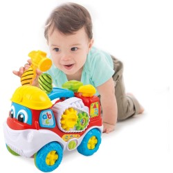 Un coloratissimo camion e un centro attività con tanti componenti da smontare e 2 attrezzi per giocare. Il blocco del motore con gli ingranaggi sul fianco si può smontare. Il bambino può giocare e far ruotare gli ingranaggi utilizzando il cacciavite. I pistoni posteriori vanno su e giù, se colpiti con il martello. Le ruote anteriori sono double-face (con o senza catene da neve), possono essere smontate ed invertite, per partire all avventura su ogni terreno! Con tasto attività sul finestrino per imparare le lettere e tante canzoncine, rime e suoni divertenti per apprendere i numeri e le forme.